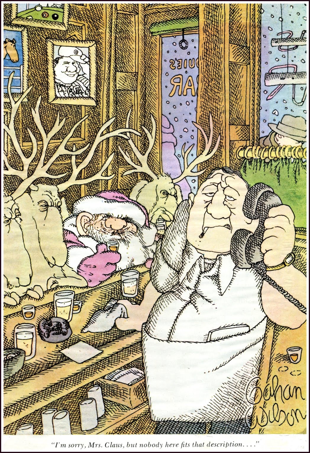 Regulars A, B, C. and bartender sit in silence.
