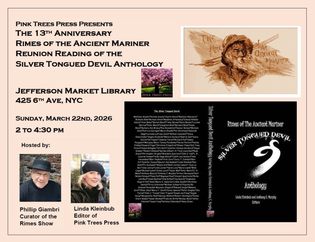 Join us to celebrate downtown writers as Pink Trees Press Presents the 13th Anniversary Rimes of the Ancient Mariner Reunion Reading of the Silver Tongued Devil Anthology. This event will feature a variety of writers, including poets, storytellers, fiction and memoir writers, spoken word artists, humorists, and essayists. Confirmed readers include: