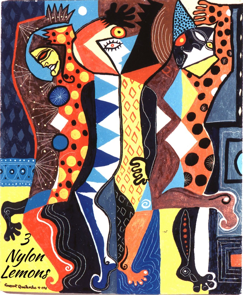 3 Nylon Lemons Are dancing elbow to elbow Heel to heel Toe to toe Heads twisted away So they never look Each other Eye to eye. 3 Nylon Lemons Are prancing to some bitter yellow music That only their ears can hear In this echo reverberating in The opaque mesh of elastic affixed thigh high 3 Nylon Lemons Sing lyrical prose abstracts Performing a terrible now ballet Choreographed in goose steps 3 Nylon Lemons Are id dancers Of the ears eyes tongues Kissing our blind deafness tasteless 7/23-8/26-2023